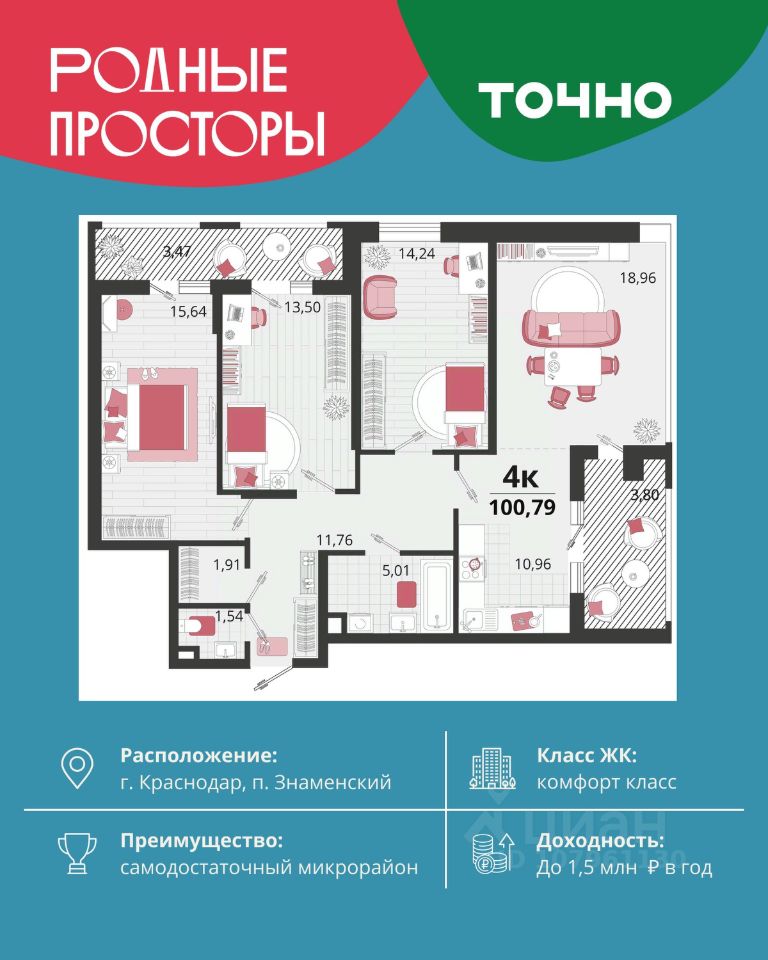 "Родные просторы"- самодостаточный микрорайон, который реализован по принципу комплексного развития территории, где есть вся инфраструктура для комфортной жизни. На территории 41 га 29 домов от 9 до 24 этажей, уютные дворы со спортивными и игровыми площадками, социальные и коммерческие объекты, зеленые массивы и фонтаны. Главная точка притяжения "Родных просторов" - парк семейного отдыха площадью 9 га, 4,5 км прогулочных аллей, амфитеатр для мероприятий, кинофестивальная площадка. Особая гордость микрорайона современная школа на 1550 мест и 3 детских сада "Ладушки", "Веснушки" и "Топотушки" на 880 малышей. В центре микрорайона строятся фитнес-клуб BALANCE с акватермальным комплексом и собственная поликлиника, площадью более 5000 кв.м. Уже открыт православный храм Святых Первоверховных апостолов Петра и Павла.
