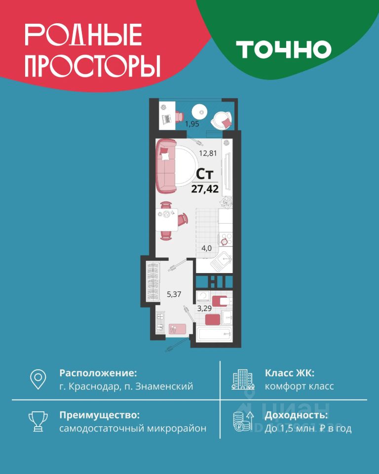 "Родные Просторы" — самодостаточный микрорайон, который реализуется по принципам комплексного развития территории. На территории 41 га возводится один из самых масштабных проектов в Краснодарском крае, который включает: 29 разновысотных домов_x000D_ от 9 до 24 этажей, уютные дворы со спортивными и игровыми площадками, социальные и коммерческие объекты, зеленые массивы и фонтаны. Главная точка притяжения "Родных Просторов" — парк семейного отдыха площадью 9 га, 4,5 км прогулочных аллей, амфитеатр для мероприятий, кинофестивальная площадка. Особая гордость микрорайона — современная школа на 1550 мест и 3 детских сада "Ладушки", "Веснушки" и "Топотушки" на 880 малышей. В центре микрорайона строятся фитнес-клуб "Баланс" с акватермальным комплексом и собственная поликлиника площадью более 5000 кв.м. Уже открыт православный храм Святых Первоверховных апостолов Петра и Павла. "Родные Просторы""— проект для жизни или инвестиций с доходом до 1,5 млн. руб. в год.*