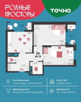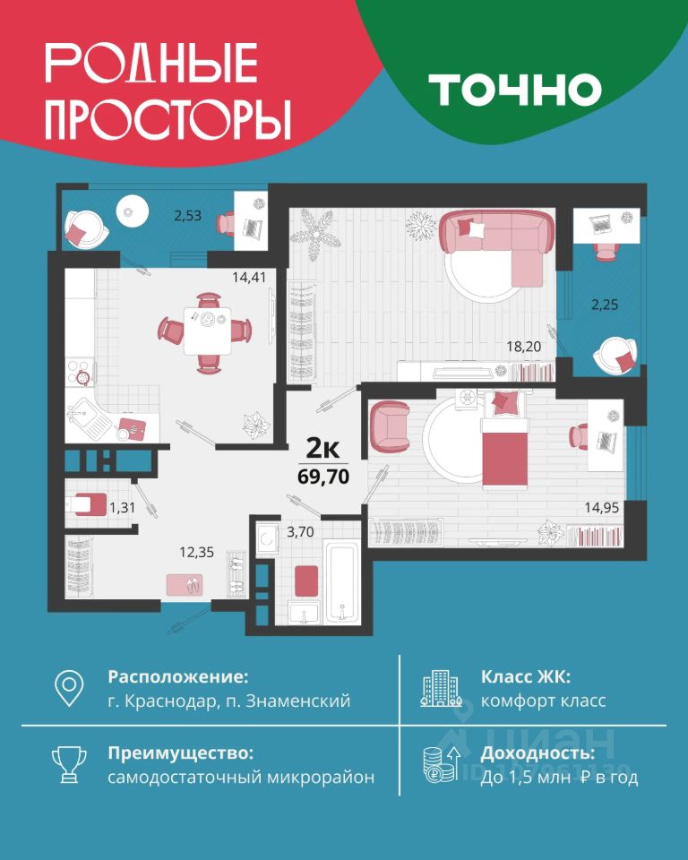 "Родные Просторы" — самодостаточный микрорайон, который реализуется по принципам комплексного развития территории. На территории 41 га возводится один из самых масштабных проектов в Краснодарском крае, который включает: 29 разновысотных домов_x000D_ от 9 до 24 этажей, уютные дворы со спортивными и игровыми площадками, социальные и коммерческие объекты, зеленые массивы и фонтаны. Главная точка притяжения "Родных Просторов" — парк семейного отдыха площадью 9 га, 4,5 км прогулочных аллей, амфитеатр для мероприятий, кинофестивальная площадка. Особая гордость микрорайона — современная школа на 1550 мест и 3 детских сада "Ладушки", "Веснушки" и "Топотушки" на 880 малышей. В центре микрорайона строятся фитнес-клуб "Баланс" с акватермальным комплексом и собственная поликлиника площадью более 5000 кв.м. Уже открыт православный храм Святых Первоверховных апостолов Петра и Павла. "Родные Просторы""— проект для жизни или инвестиций с доходом до 1,5 млн. руб. в год.*