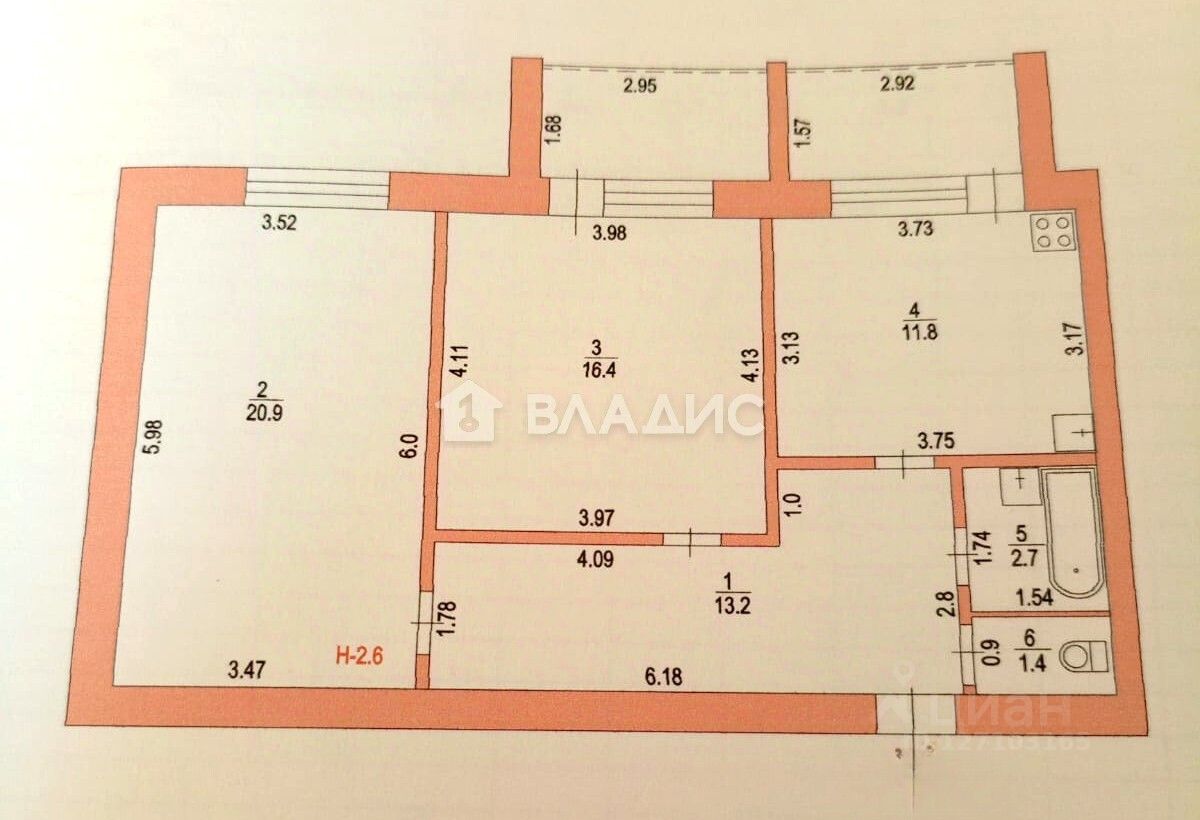 Две изолированные комнаты 20,9 кв.м, 16.4 квм, кухня 11,8 кв.м, коридор 13,2 кв.м, ванная 2,7 кв.м, туалет 1,4 кв.м. Два застекленных балкона. Выполнен косметический ремонт в пастельных тонах.