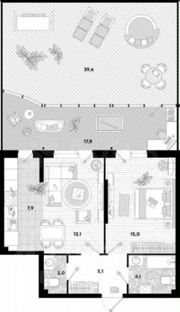 Евродвушка (47.7 кв.м) с объединенной кухней-гостиной, изолированной спальней с гардеробной, санузлом и прачечной. Три выхода на закрытую терассу (площадь 17.8 кв.м), которую можно использовать как лаунж-зону или как отдельную комнату. Квартиру покупали для себя и планировали там сделать обеденную зону, поставить диван и проектор для просмотра фильмов. С закрытой террасы выход на открытую терассу (площадь 39,6 кв.м), где свободно можно разместить шезлонги, мангальную зону и отдыхать будто за городом, покупали квартиру именно с этим расчетом))).