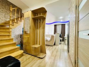 Помещения в квартире расположены в 2 уровня. Первый этаж - гостевая зона с просторной кухней гостиной и санузлом. Второй этаж - приватная зона, где поместилось три спальни, санузел и холл.