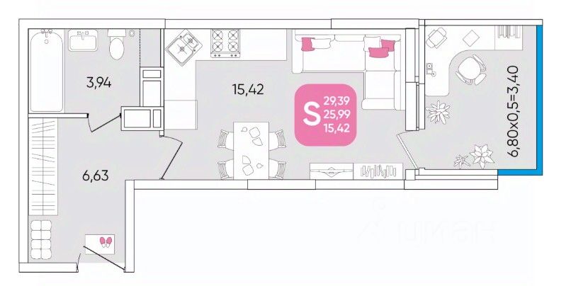 Удобная планировка студии позволяет эргономично разместить функциональный кухонный гарнитур, обеденную зону и уютную зону отдыха. Просторная лоджия станет прекрасным местом для организации рабочего кабинета или уютной лаунж-зоны, а вид из окон на улицу подарит вам возможность наслаждаться каждым закатом, который открывается с этой высоты.
