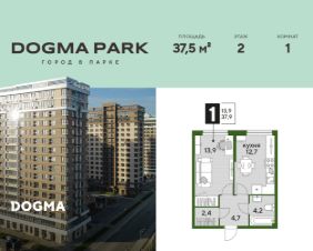 В продаже 1-комнатная квартира от застройщика! Мкр. "DOGMA PARK" г. Краснодар, Литер 3 Срок сдачи: 4 кв. 2026, общей площадью 37.5 кв.м., на 2 этаже.