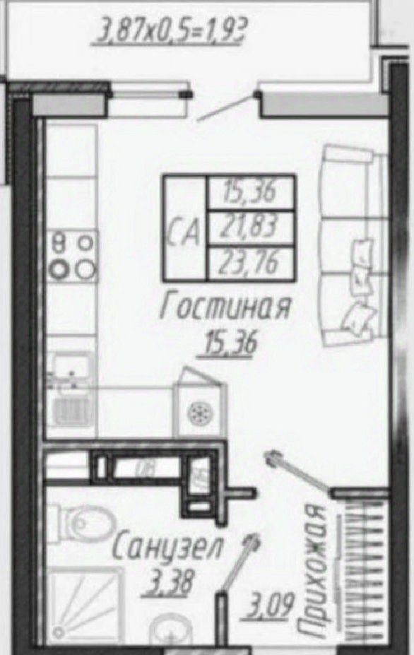 Квартира площадью 22,2 м2 плюс лоджия 4 м2 площадь,