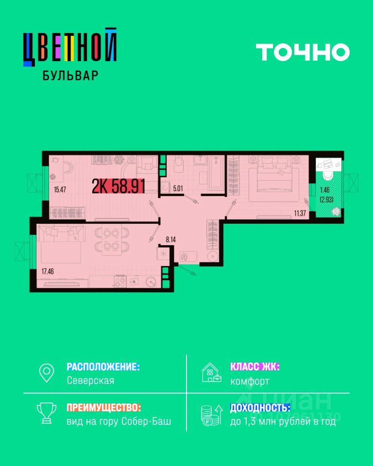 "ЖК "Цветной бульвар" — расположен в живописной станице Северская Краснодарского края и занимает территорию более 24 гектаров. Это семь кварталов комфортной среднеэтажной застройки (58 этажей), где каждый найдёт идеальную квартиру: от уютных студий до просторных двухуровневых апартаментов с террасами и видом на гору Собер-Баш. Главное пространство комплекса — зеленый бульвар длиной 460 метров с прогулочными аллеями, фонтаном, зонами отдыха и спортивными площадками. Здесь приятно гулять всей семьёй и проводить время на свежем воздухе. На территории предусмотрены современные детские площадки с безопасным покрытием, воркаут-зоны, трёхуровневое ландшафтное озеленение с газонами и кустарниками, уютные дворы без машин, более 5 000 м² коммерческой инфраструктуры, а также детский сад на 350 мест и новая школа с музеем и STEAM-лабораторией. "Цветной бульвар" — это новый уровень комфорта, где природа и современная архитектура создают пространство для счастливой жизни."