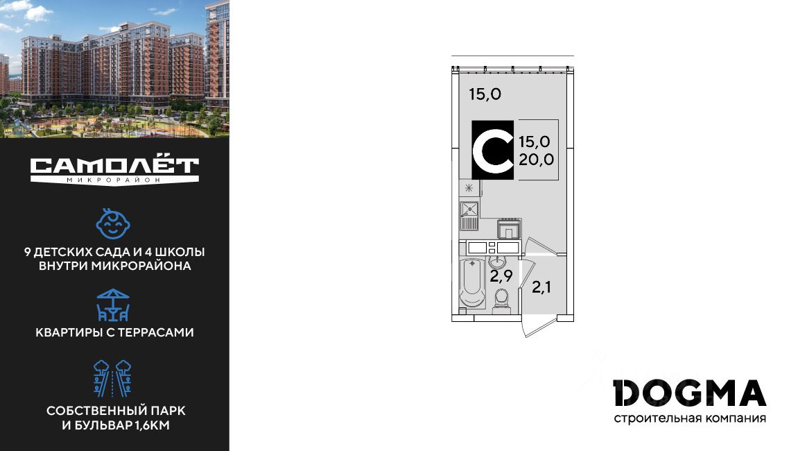 DOGMA - ТОП-3 застройщик по объему строительства в РФ. "САМОЛЁТ" — концептуальный жилой микрорайон, который расположен на северо-западе Краснодара, в районе Западного Обхода. Квартал спроектирован как "город в городе", поэтому здесь будет всё для комфортной жизни: современные дома с разными планировками, дороги, школы и детские сады, поликлиника, торговые центры, парки и аллеи. Микрорайон находится далеко от промышленных предприятий, сочетает удобство городской жизни и экологически благоприятную среду. Инфраструктура нового микрорайона: • 4 школы и 9 детских садов на территории микрорайона • Функциональные планировки • Собственный бульвар протяжённостью 1,6км • Светомузыкальный фонтан протяжённостью 55 метров • Амфитеатр • Парк 7 ГА • Скейт-парк • Детская аква-площадка • Круглосуточное видеонаблюдение и пост охраны Приобрести квартиру можно одним из способов: ипотека, рассрочка, наличный расчет.