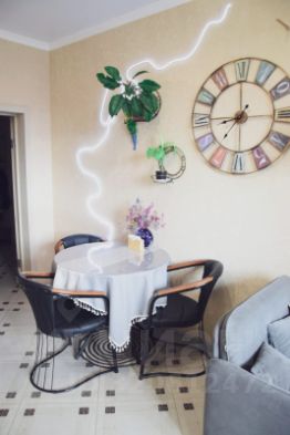 Просторная однокомнатная квартира (50 кв.м.), состоящая из большой прихожей, свободной ванной комнаты, кухни (зона ТВ+диван, обеденная зона, зона приготовления пищи) и гостиной, разделенной декоративной перегородкой на спальню и детскую (возможно продлить перегородку и вставить дверь, чтобы была отделенная детская. Спальня при этом достаточно вентилируется из кухни).