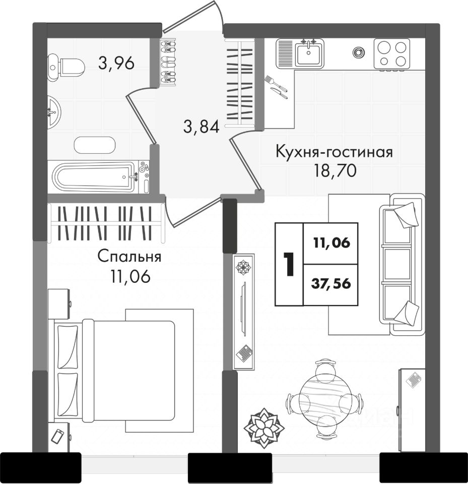 1-комнатная квартира, как 2-комнатная в жилом комплексе Зеленая территория от надежного застройщика СЗ Флагман в Краснодаре.