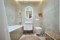 Санузел в плитке под натуральный камень: акриловая ванна, инсталляция, тумба, зеркало с подсветкой