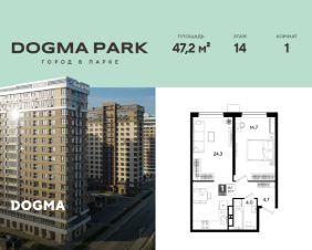 В продаже 1-комнатная квартира от застройщика! Мкр. "DOGMA PARK" г. Краснодар, Литер 19 Срок сдачи: 4 кв. 2027, общей площадью 47.2 кв.м., на 14 этаже.