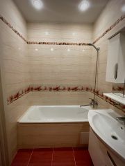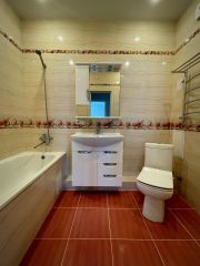 Кухня с выделенными зонами под технику, санузел с изящной плиткой и современной сантехникой.