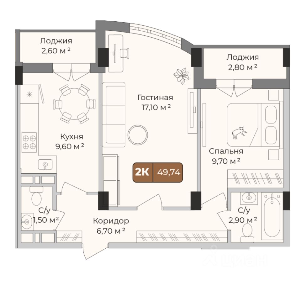 Общая площадь49,74 м²
