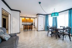 Здесь каждая комната оформлена с любовью к деталям, сочетая в себе современный дизайн и функциональность. Большие панорамные окна позволяют наслаждаться потрясающим видом на город прямо из вашего дома. Кухня-гостиная совмещена, что создает комфортную зону для общения с семьей и друзьями.