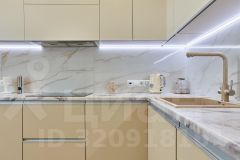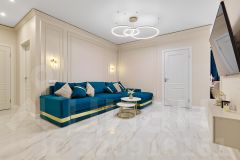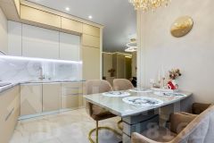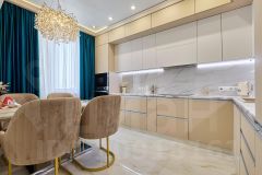 - в кухне-гостиной выложена в едином стиле турецкая плитка, теплые полы, на стенах сатиновая краска, по контуру стен - декорированные молдинги, раздельное точечное освещение с проходными выключателями. Одна из главных роскошей - дагестанская люстра выполненная из стекла. В кухне полностью встроенная техника - DORENJE, посудомоечная машина - BOSH, индукционная плита - ELECTRO LUX, духовой шкаф, микроволновая печь, смеситель фирмы - DR.GANS;