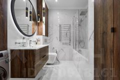 - в санузле выложена испанская широкоформатная плитка керамогранит 1,2 м на 60 см, вся мебель встроенная под заказ, теплые полы;