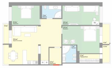 Эксклюзивная просторная планировка на две стороны, общей площадью 141 м2 (153 м2 вместе с лоджиями), расположена на 14 этаже 15-этажного дома.