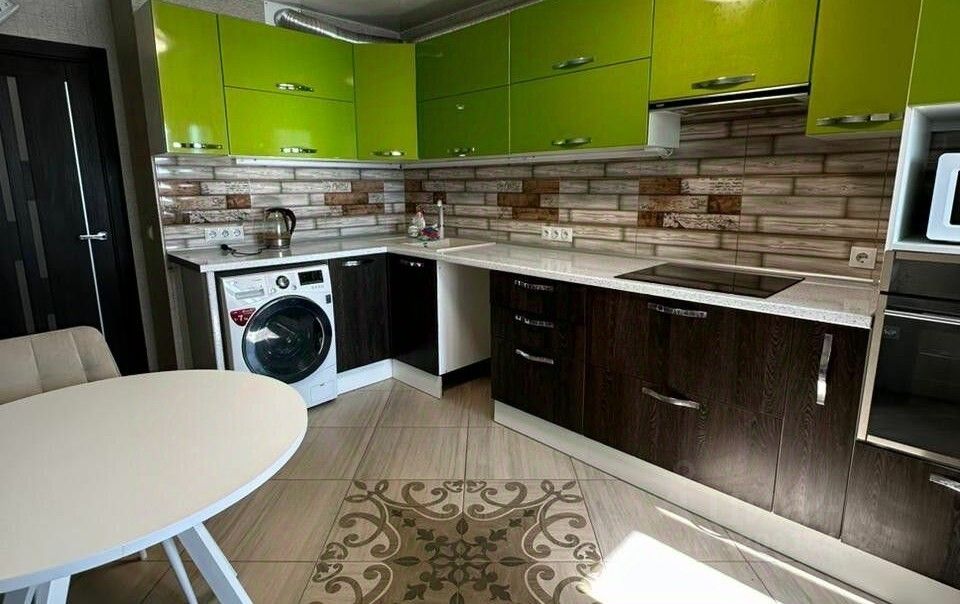 Дорогая входная дверь с шумоизоляцией , в коридоре и кухне на полу керамогранит, хорошие межкомнатные двери на магнитах. Встроенная кухня около 6 м, все с доводчиками, качественная каменная раковина. Духовка Hansa, варочная панель Elextrolux. Стиральная машина выведена на кухню ,марка LG. В ванной дорогая инсталляция, унитаз с доводчиком.