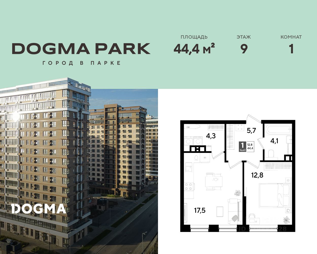 В продаже 1-комнатная квартира от застройщика! Мкр. "DOGMA PARK" г. Краснодар, Литер 31 Срок сдачи: 3 кв. 2027, общей площадью 44.4 кв.м., на 9 этаже.