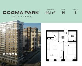 В продаже 1-комнатная квартира от застройщика! Мкр. "DOGMA PARK" г. Краснодар, Литер 31 Срок сдачи: 3 кв. 2027, общей площадью 44.1 кв.м., на 14 этаже.