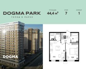 В продаже 1-комнатная квартира от застройщика! Мкр. "DOGMA PARK" г. Краснодар, Литер 14 Срок сдачи: 4 кв. 2027, общей площадью 44.4 кв.м., на 7 этаже.