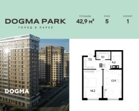 В продаже 1-комнатная квартира от застройщика! Мкр. "DOGMA PARK" г. Краснодар, Литер 30 Срок сдачи: 3 кв. 2027, общей площадью 42.9 кв.м., на 5 этаже.