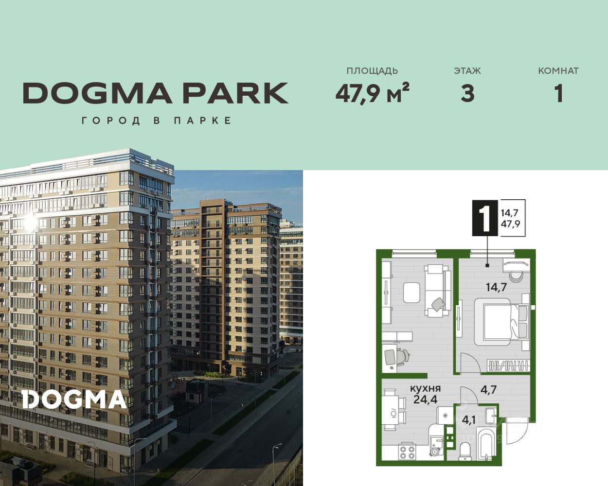 В продаже 1-комнатная квартира от застройщика! Мкр. "DOGMA PARK" г. Краснодар, Литер 23 Срок сдачи: 4 кв. 2027, общей площадью 47.9 кв.м., на 3 этаже.