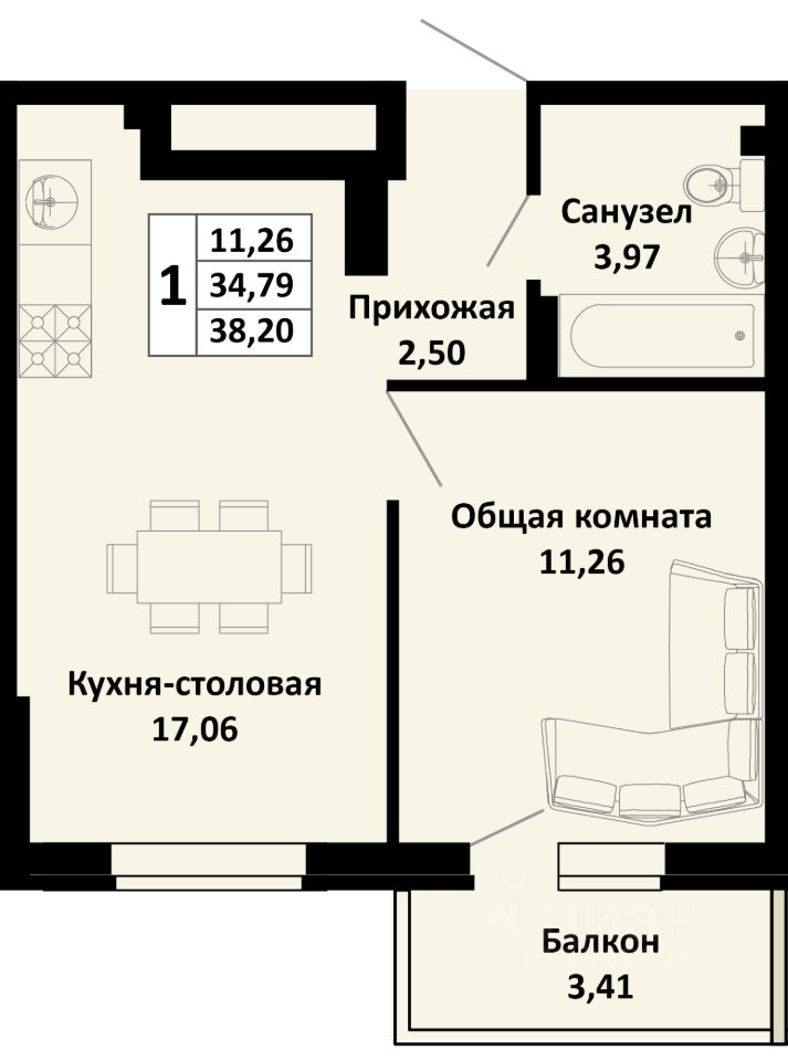 Общая площадь38,2 м²
