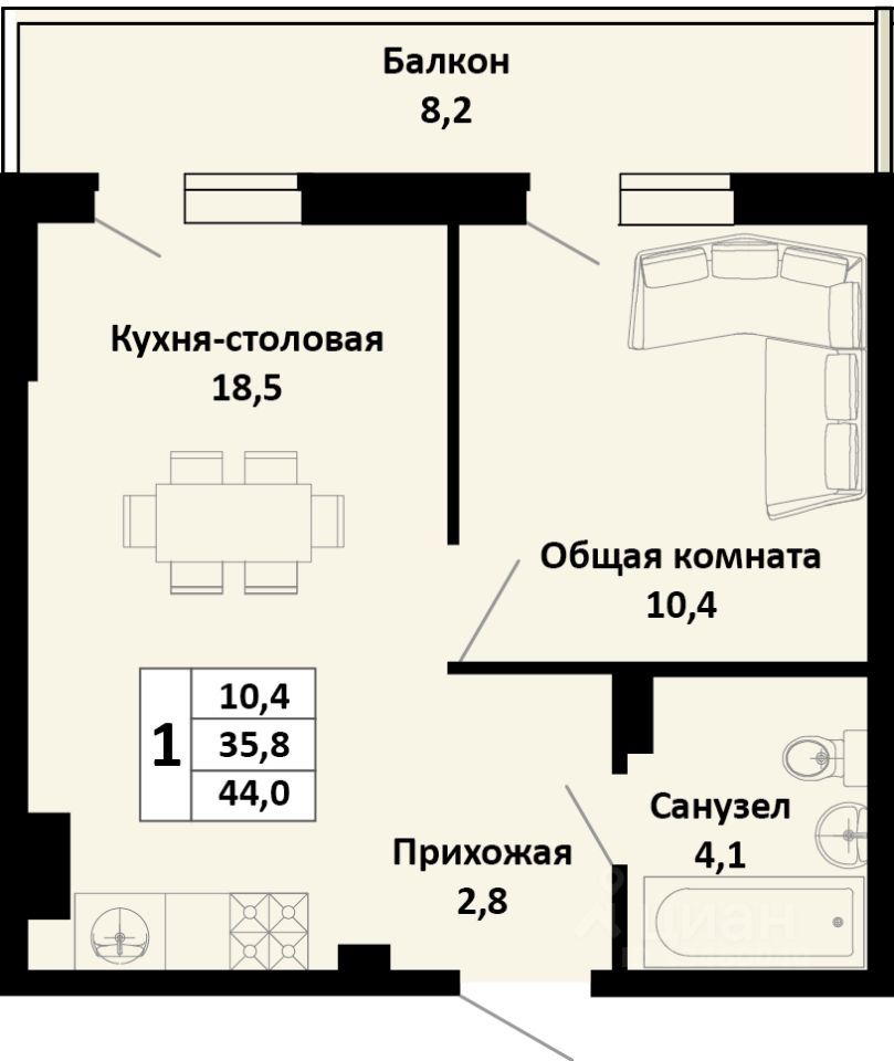 Общая площадь44 м²