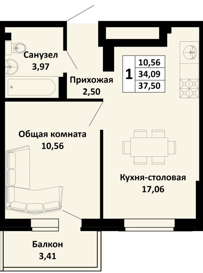 1-комнатная квартира в новом жилом комплексе комфорт-класса "Южные соседи" в тихом зелёном районе Краснодара, мкр. Молодёжный (ул. Северная, 42).