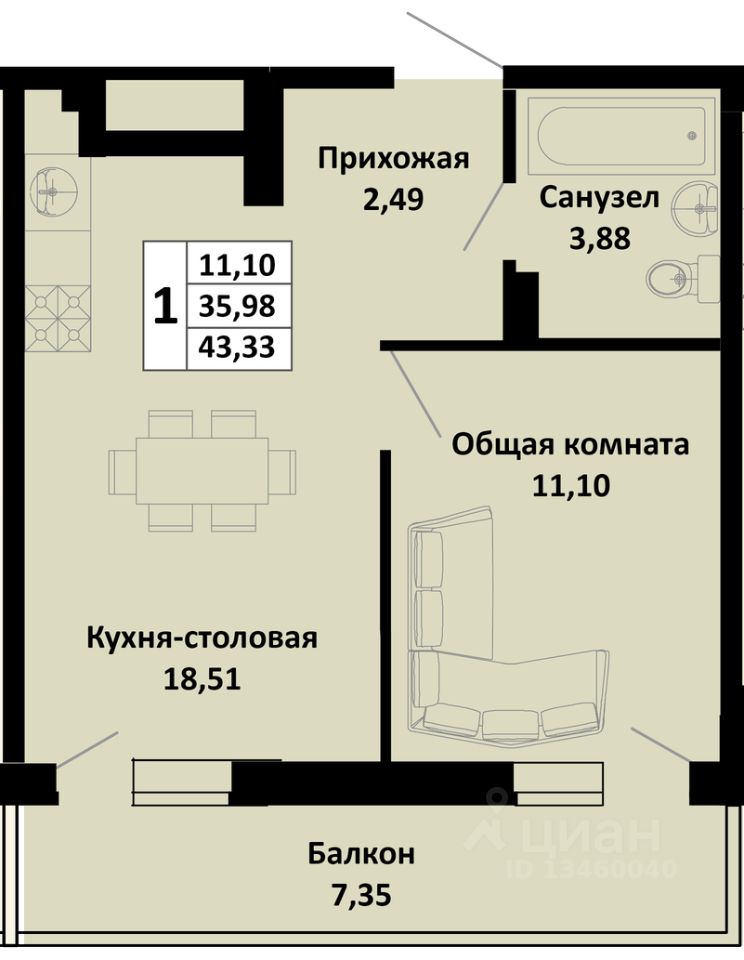 1-комнатная квартира в новом жилом комплексе комфорт-класса "Южные соседи" в тихом зелёном районе Краснодара, мкр. Молодёжный (ул. Северная, 42).