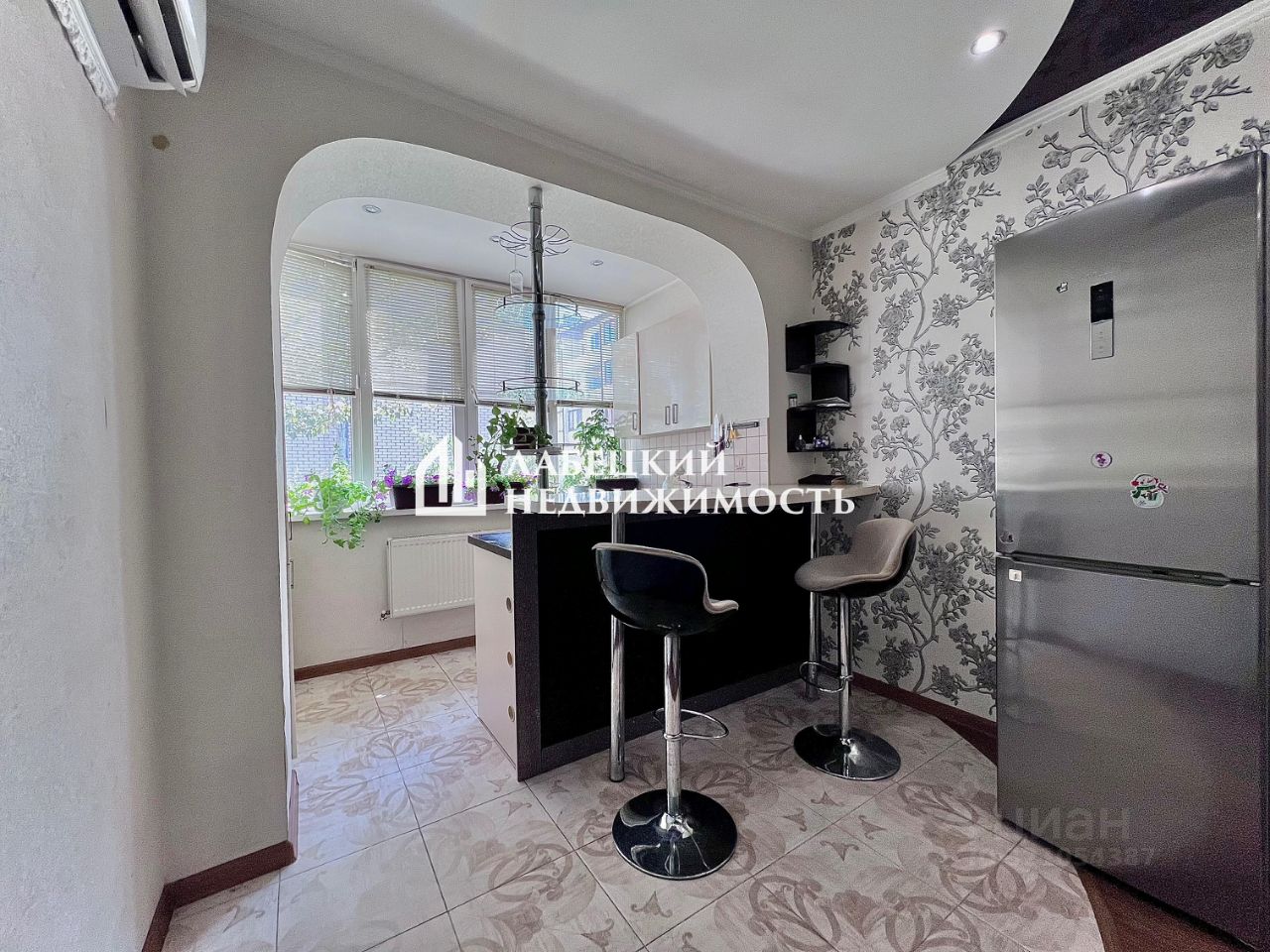 - Кухня совмещённая с гостиной, в ней выполнен хороший ремонт и приятный дизайн. Кухня делится на зоны небольшим островком (барной стойкой). Светлый кухонный гарнитур и приятный вид из окна создают уют. Установлена так же сплит система.