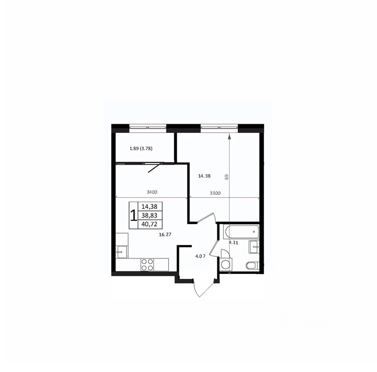 Общая площадь40,72 м²