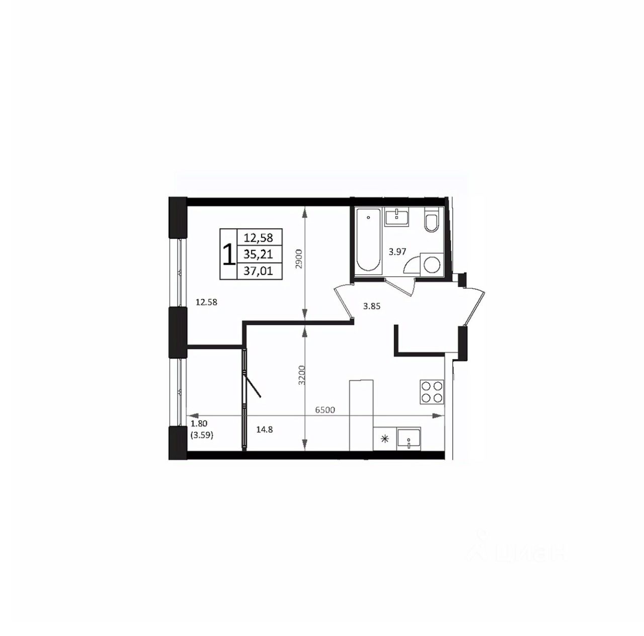Общая площадь37,01 м²