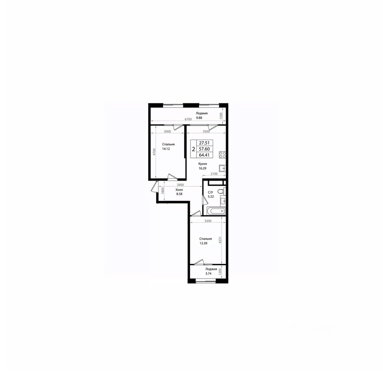 Общая площадь64,41 м²