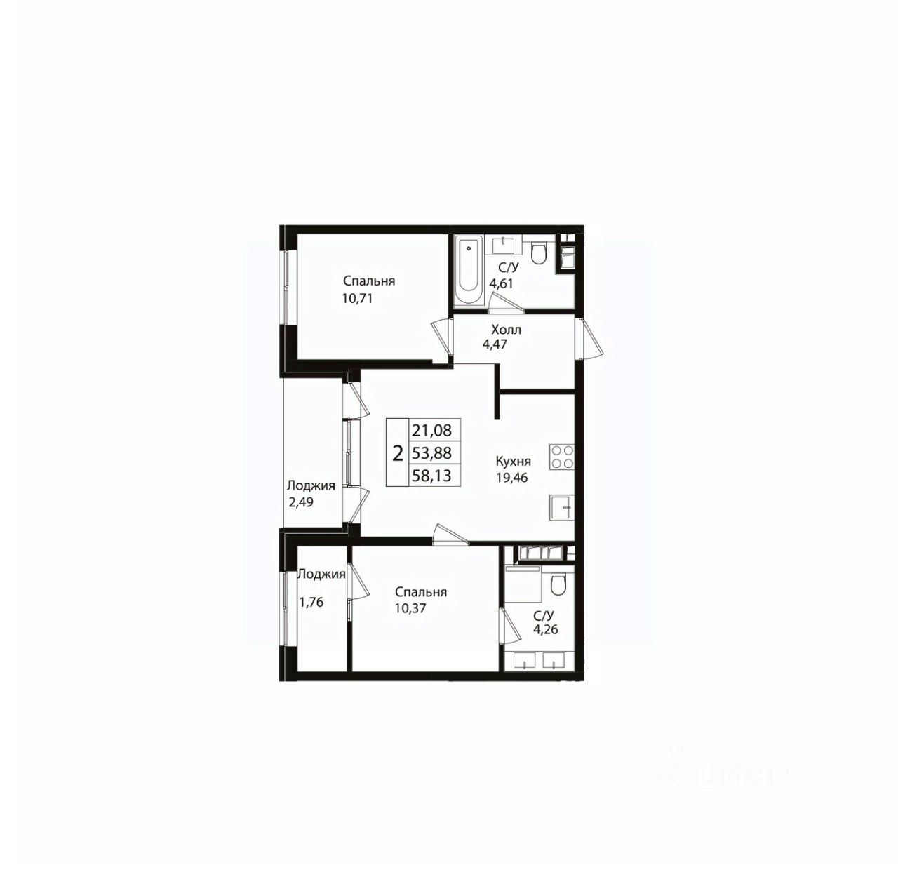 Общая площадь58,13 м²