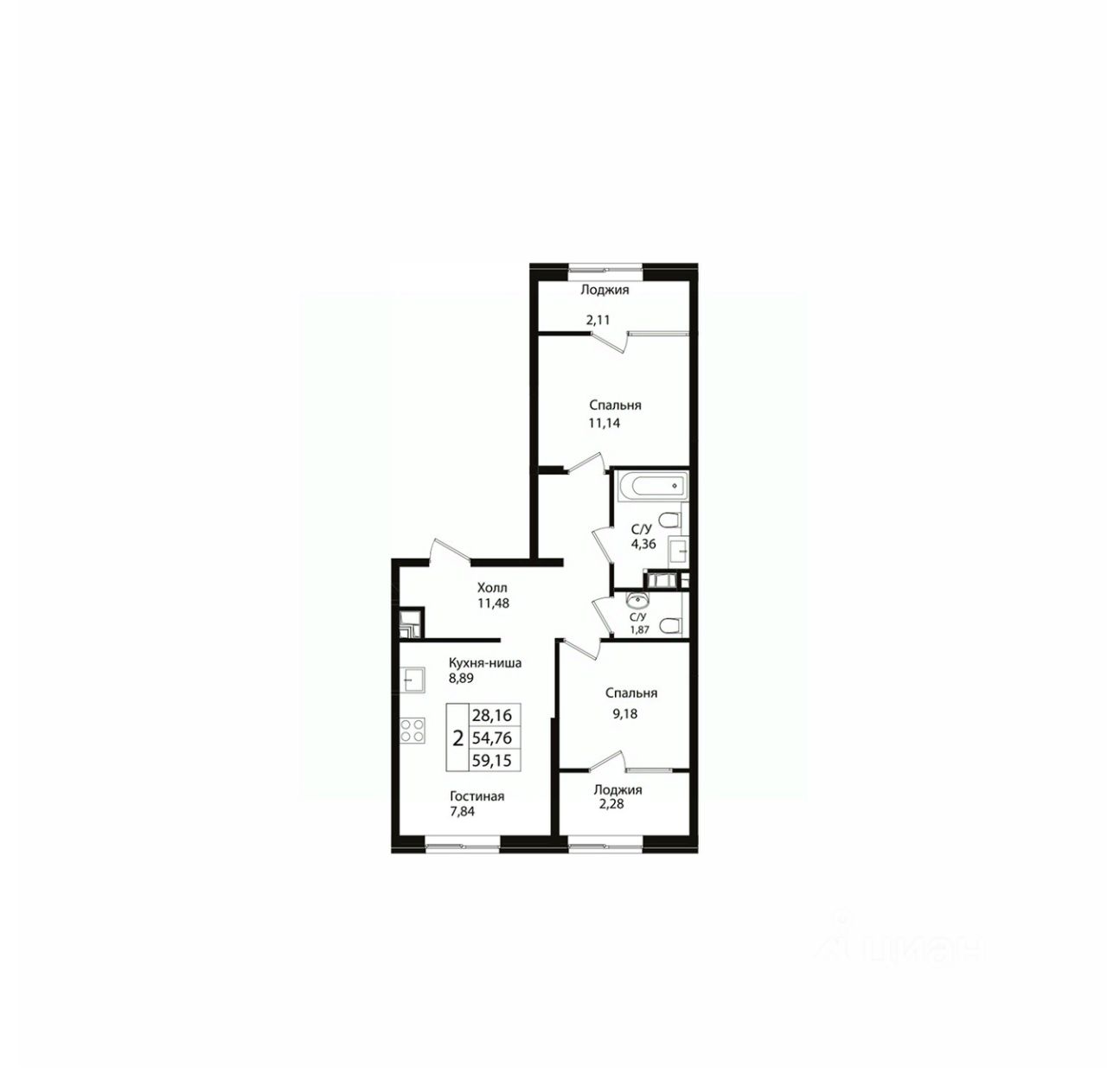 Общая площадь59,15 м²