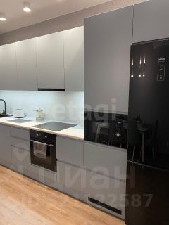 В кухне установлен стильный двухуровневый гарнитур с современной мойкой, встроенная четырёхконфорочная варочная поверхность с духовым шкафом, микроволновая печь и холодильник.