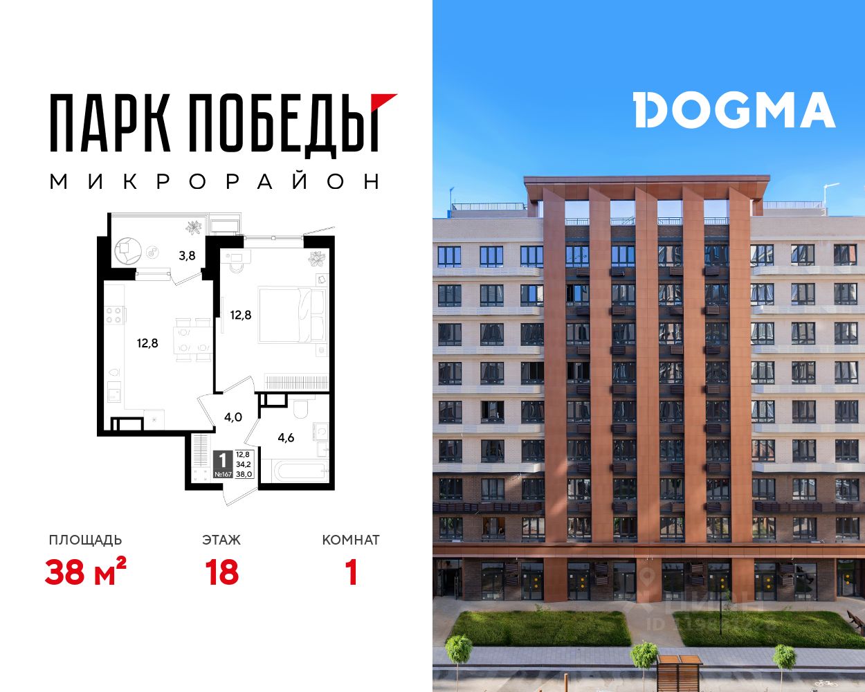 Срок сдачи: 2 кв. 2026, общей площадью 38 кв.м., на 18 этаже.