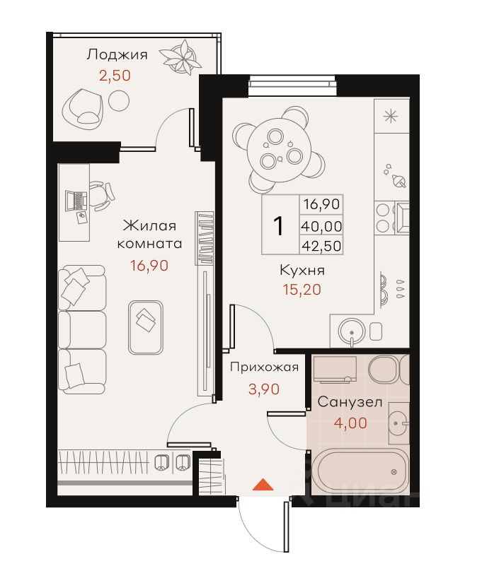 Общая площадь42,5 м²