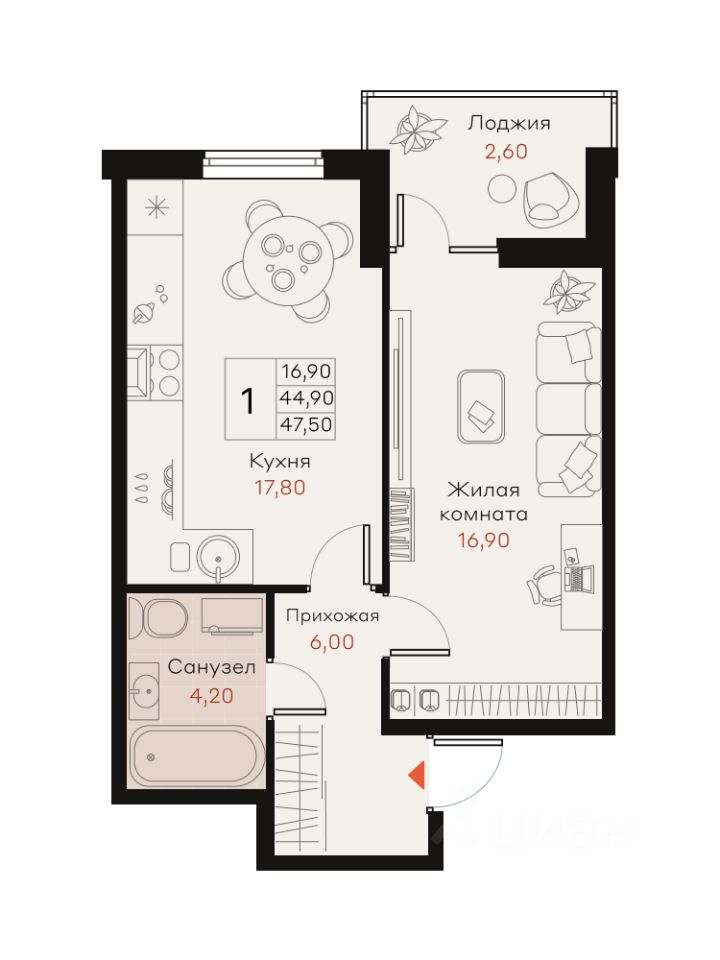 Общая площадь47,5 м²