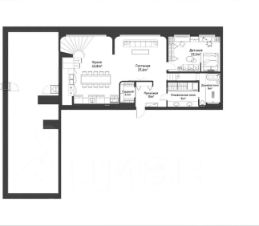 На первом этаже расположена при входе гардеробная 4м2, кухня-43,8 м2 со встроенной мебелью и техникой, гостиная-27,6 м2,