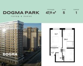 В продаже 1-комнатная квартира от застройщика! Мкр. "DOGMA PARK" г. Краснодар, Литер 34 Срок сдачи: 4 кв. 2027, общей площадью 47.9 кв.м., на 5 этаже.