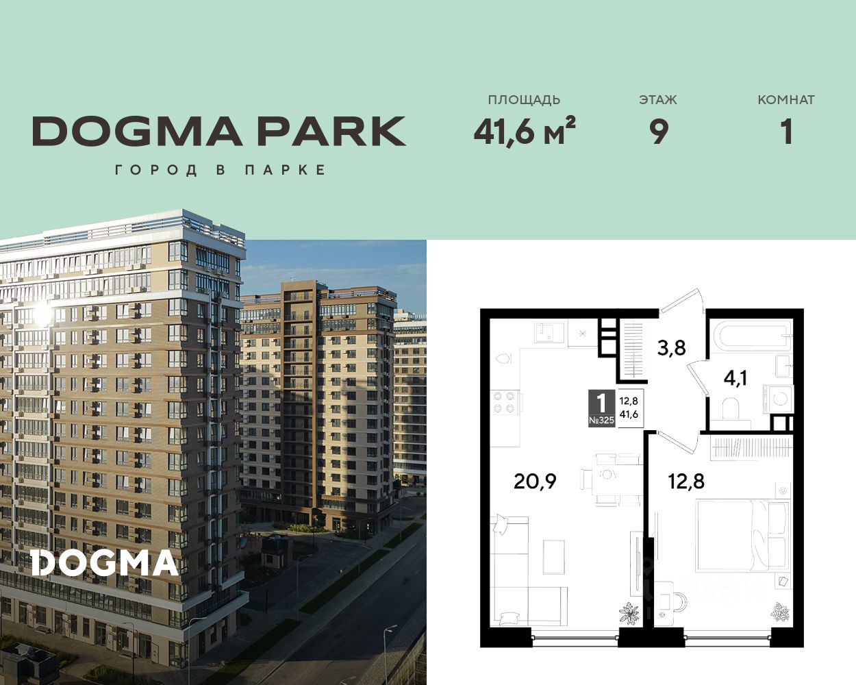 В продаже 1-комнатная квартира от застройщика! Мкр. "DOGMA PARK" г. Краснодар, Литер 34 Срок сдачи: 4 кв. 2027, общей площадью 41.6 кв.м., на 9 этаже.