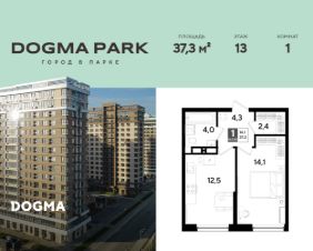 В продаже 1-комнатная квартира от застройщика! Мкр. "DOGMA PARK" г. Краснодар, Литер 34 Срок сдачи: 4 кв. 2027, общей площадью 37.3 кв.м., на 13 этаже.