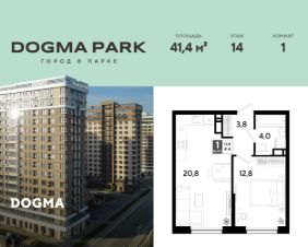 В продаже 1-комнатная квартира от застройщика! Мкр. "DOGMA PARK" г. Краснодар, Литер 34 Срок сдачи: 4 кв. 2027, общей площадью 41.4 кв.м., на 14 этаже.