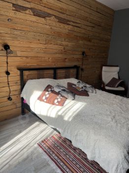 Основная спальная комната с витражным остеклением. Одна из стен обшита натуральным деревом, освещение и розетки в стиле лофт. При желании можно зонировать ширмой спальное место и компьютерный стол.