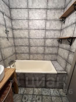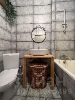 Ванная комната в стиле лофт в серых тонах с деревянными полками. Раковина установлена на деревянное подстолье, под которым расположилась корзина для белья.
