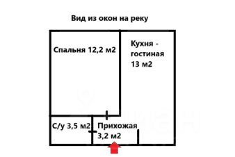 Удобная планировка с кухней-гостиной 13 м2, широкая спальня 12,2 м2, совмещенный санузел 3,5 м2 и прихожая 3,2 м2.