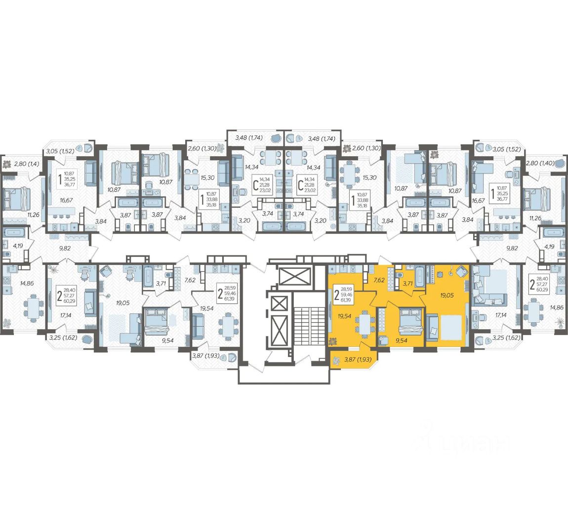 Продаётся 2-комнатная квартира в строящемся доме (Дом Литер 1), срок сдачи: 1 кв. 2025, общей площадью 61.39 кв.м., на 22 этаже. Без отделки, но с возможностью заказать отделку